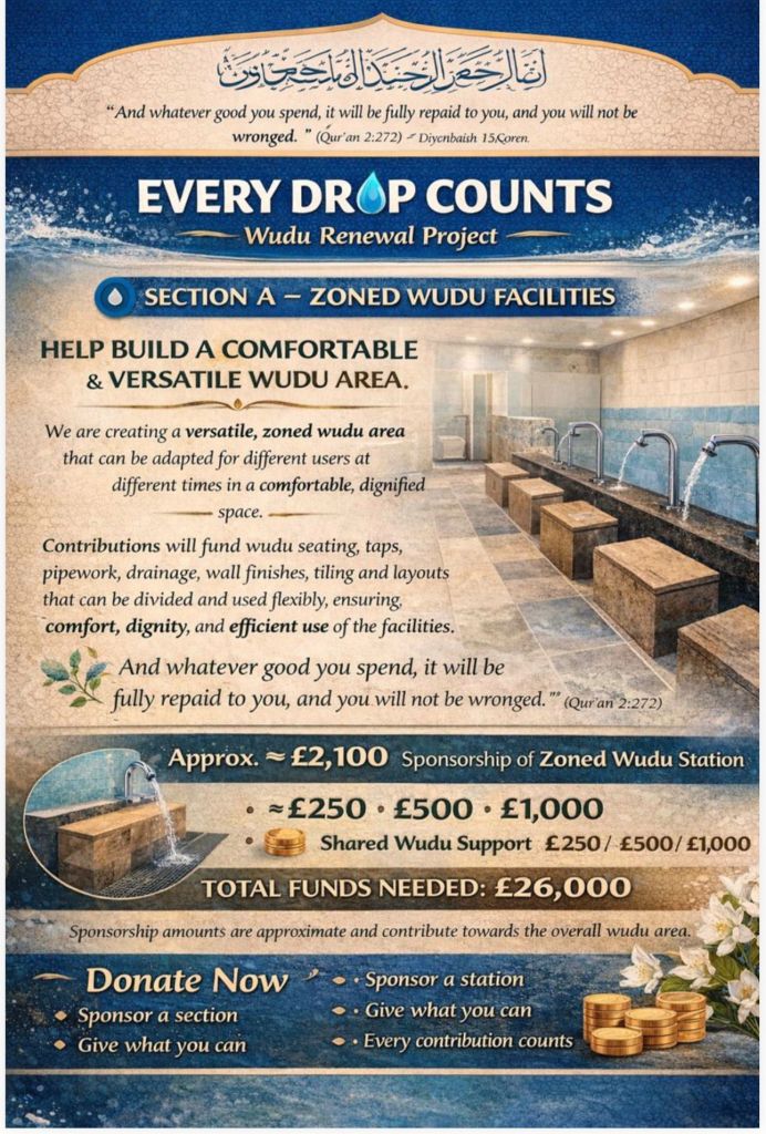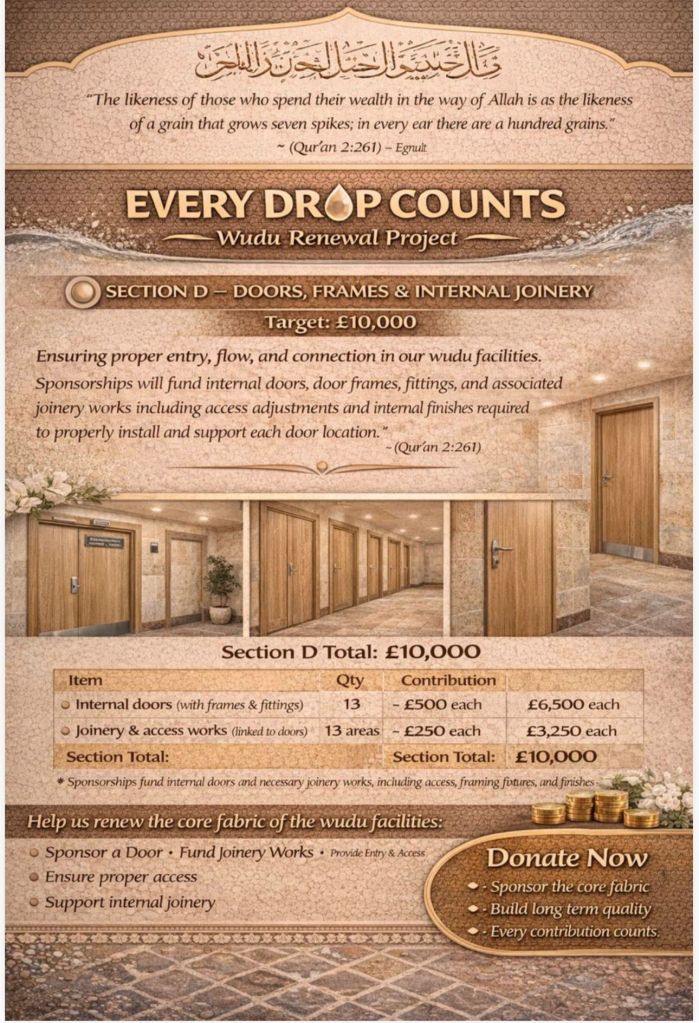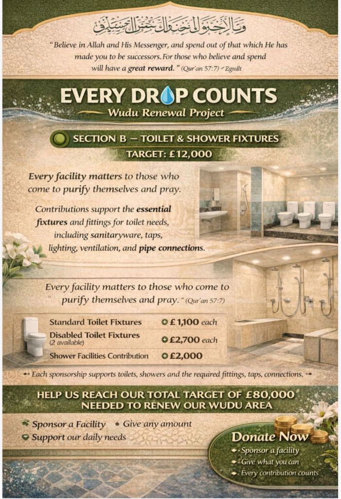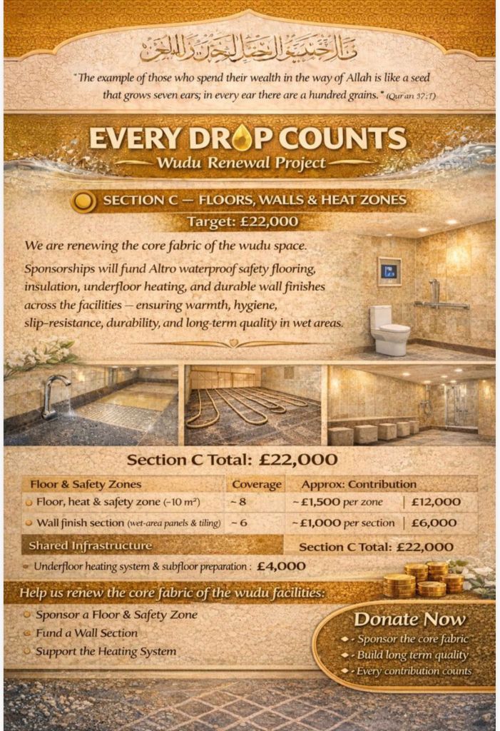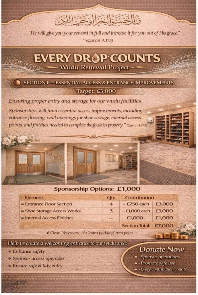 Phase 1 – Main Entrance, Brothers & Sisters wudhu area. £180,000