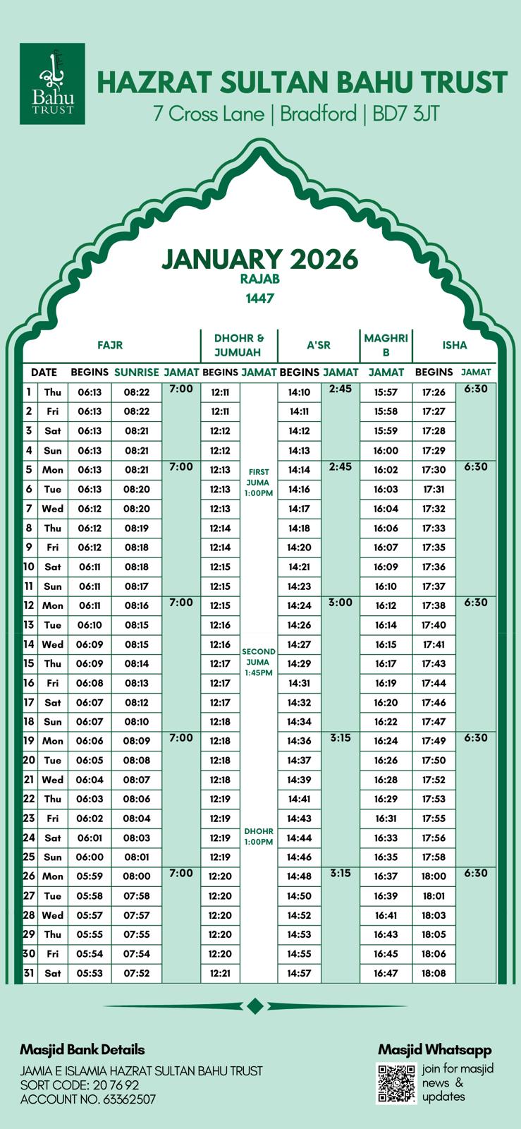 Every day, the Sultan Bahu Bradford Masjid website updates it’s prayer, salah and jamaat times. We try to ensure our times run parallel with the Masjid so that you will always know when a jamaat will begin.